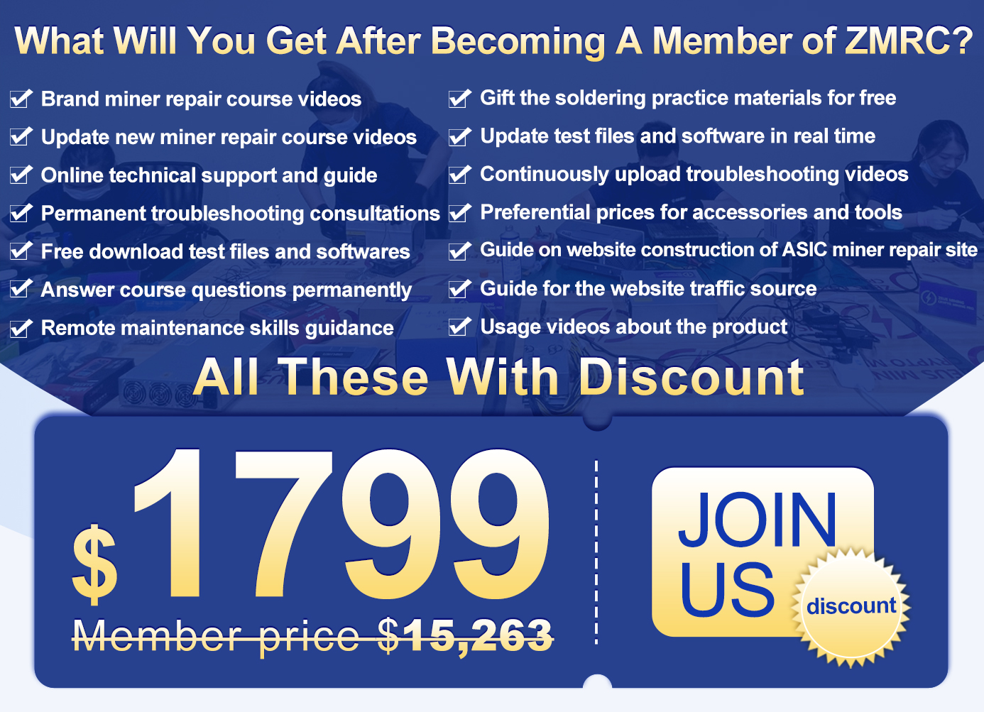 Welcome to the payment page of ZMRC. The price of our course membership is $15263. In order to help more friends quickly master the skills of miner maintenance, now launched a special discounted price: $1799. After completing the payment and becoming our member, you will get the following benefits: